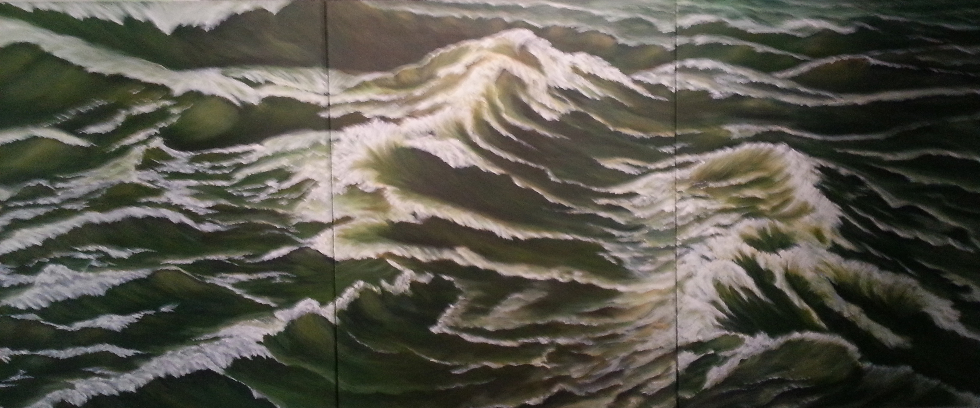 This painting is my impression of being beyond the wash and the break, a dangerous place. A point too far out to change my mind and return to the safety of the sandy beach without being crushed by the next set. Too close to the break to be lifted over the larger oncoming waves. Going over the falls and getting clobbered in a wave’s spin cycle is enough of a threat to push through my breathlessness and tired muscles. Keep swimming…for another chance to fly!